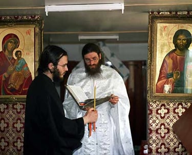 Rugăciunea şi ajutorul Sfântului acoperă mănăstirea că un clopot protector. Părintele Iustin Petre e convins de acest lucru şi nu încetează să se uimească. La 26 de ani, e printre cei mai tineri stăreţi din ţară. Doi ani îl despart de frumoasă perioada de studenţie de la Cluj dar, în realitate, de atunci pare să fi trecut o viaţă de om. Ochii lui albaştri, păstrând încă brumă de oboseală a slujbei de noapte, cercetează un punct imprecis, pierdut în depărtarea ferestrei. De loc e din Bucovina, provenind dintr-o familie de ţărani credincioşi.